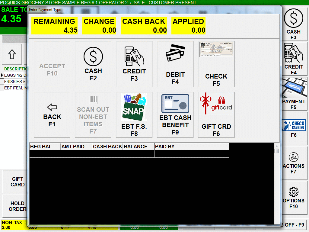 PDQuick Retail POS supports Credit Card, Debit Card and EBT Payment Tenders within any order. Use your existing credit card machine with ease. Simply ring up items as usual, choose the payment type (EBT, Credit, Debit), then process the customer card on your non integrated machine. Once you have an approved authorization choose accept on PDQuick Retail POS. You will then be immediately ready for your next transaction. Reporting in the Sales Register, X & XX Register will reflect the various payment types. After Posting your daily sales the EBT amounts will be transferred to the General Ledger and other accounting modules. |