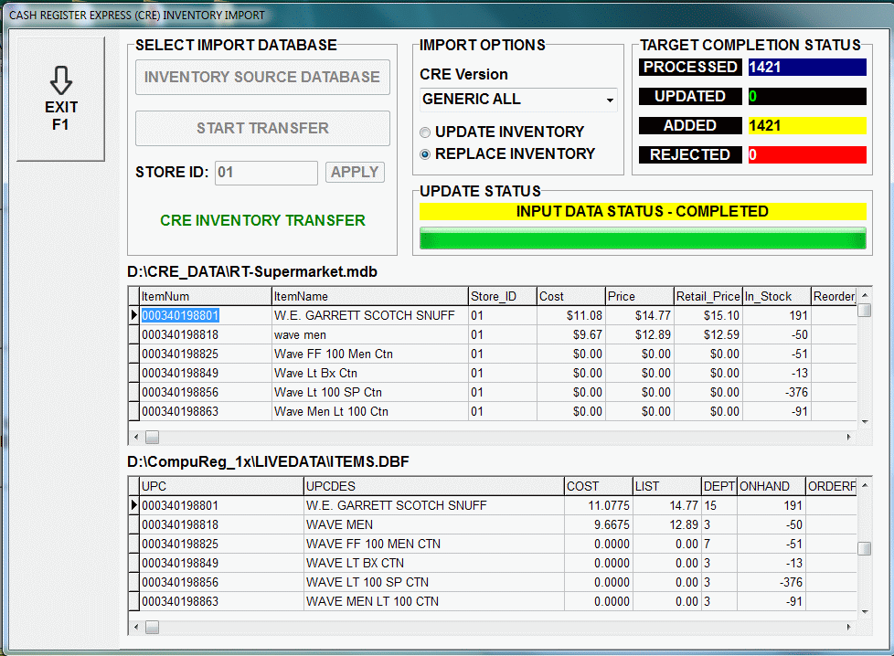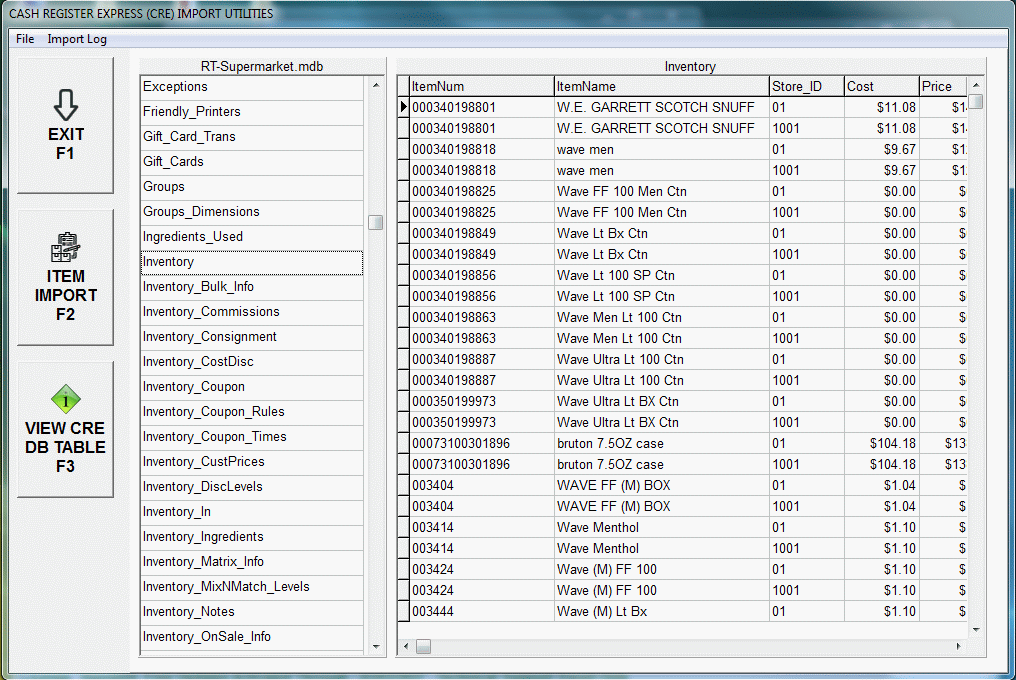 Cash Register Express Inventory Database Fields we transfer: ItemNum | ItemName | Cost | Price | In_Stock | Reorder_Level | Reorder_Quantity Dept_Id | AutoWeigh | TAX_1 | TAX_2 | TAX_3 | FoodStampable | Last_Sold | IsModifier |