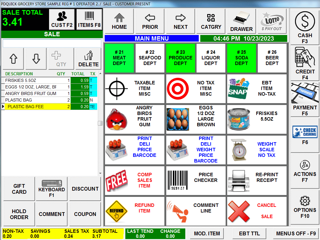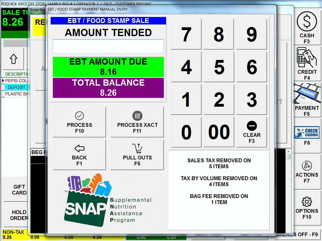 Plastic Bag Tax line showing the customer the amount of Plastic Bag Tax they were charged. EBT / Food Stamp compliance : EBT compliance is achieved by removing the Plastic Bag Tax from the current sale once an EBT, Food Stamp is selected. If the EBT payment is abandoned for any reason the Plastic Bag Tax will be added back into the order so that an alternate payment method can be selected. |