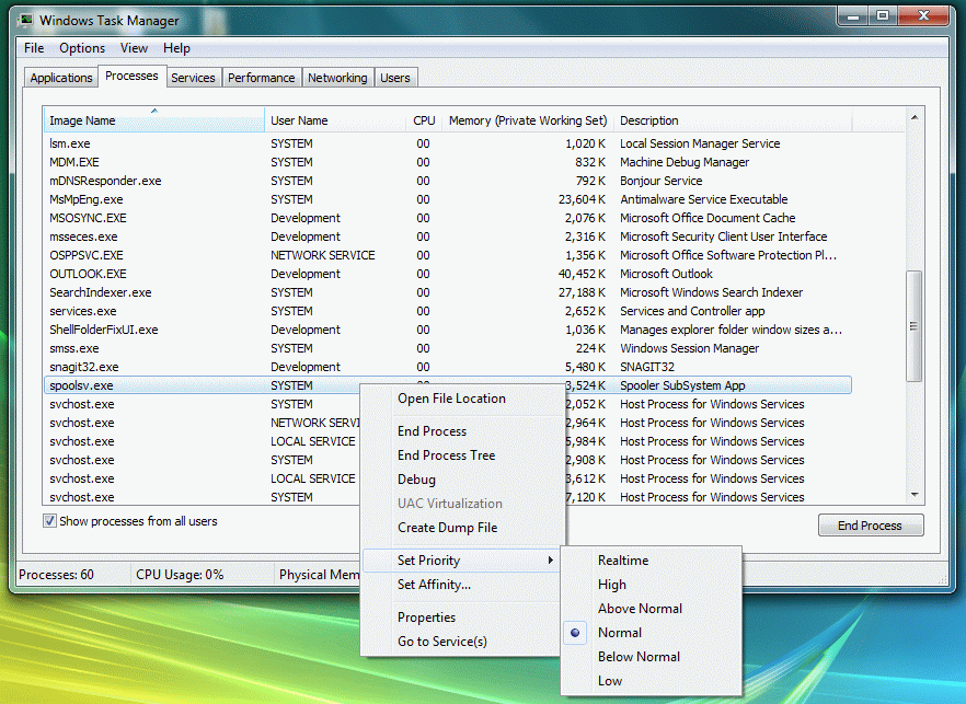 Performance Hacks : PDQuick Retail Software uses the Windows Printer Spooler to send data to the printers and pole display. If you find that there is latency when ringing up items you can try changing the Windows Spooler Priority. We cannot guarantee this will improve performance due to numerous conditions such as your Pole Display Driver, Computer performance and many other factors outside of our control. We also find USB devices have the poorest performance of all windows interfaces types regardless of your USB's version level. 1. Open the Windows Task Manager. 2. Click Services then scroll down to spoolsv.exe 3. RIGHT mouse click, scroll to Set Priority. 4. Try various settings to see if you can get better performance. 5. If you Restart Windows the setting may revert back to normal priority. Consult with your local computer expert to make these settings permanent if necessary. |